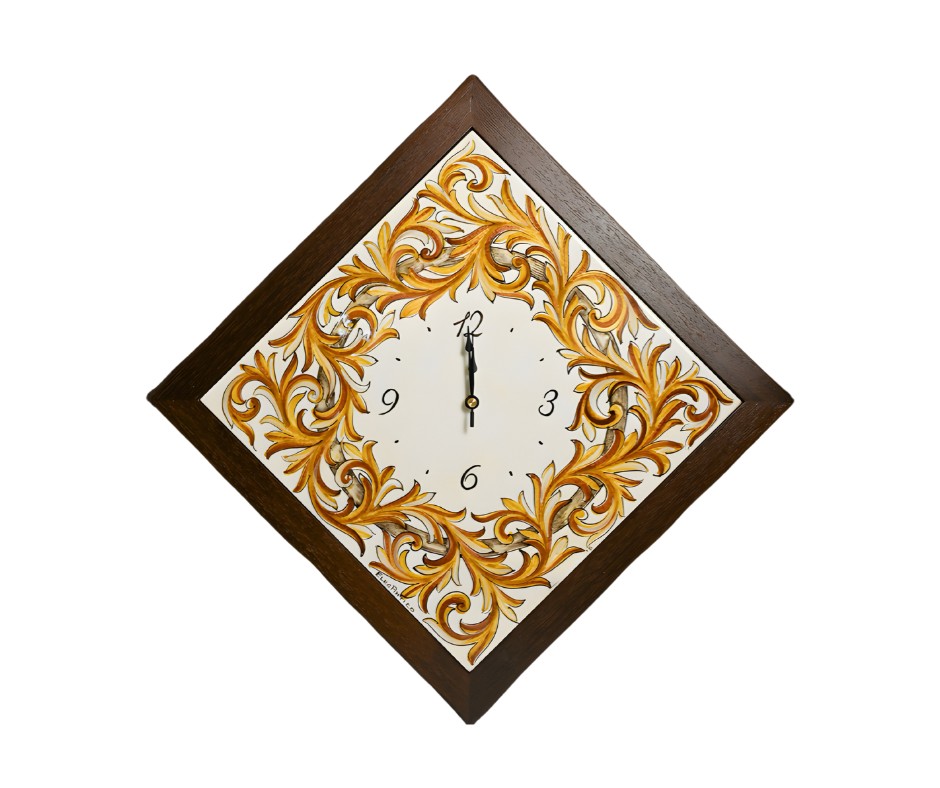 The Baroque Flourish wall clock is a luxurious ceramic wall clock adorned with golden baroque design. This elegant piece stands in a rich dark wooden frame. It seamlessly combines classic artistry with timeless functionality.