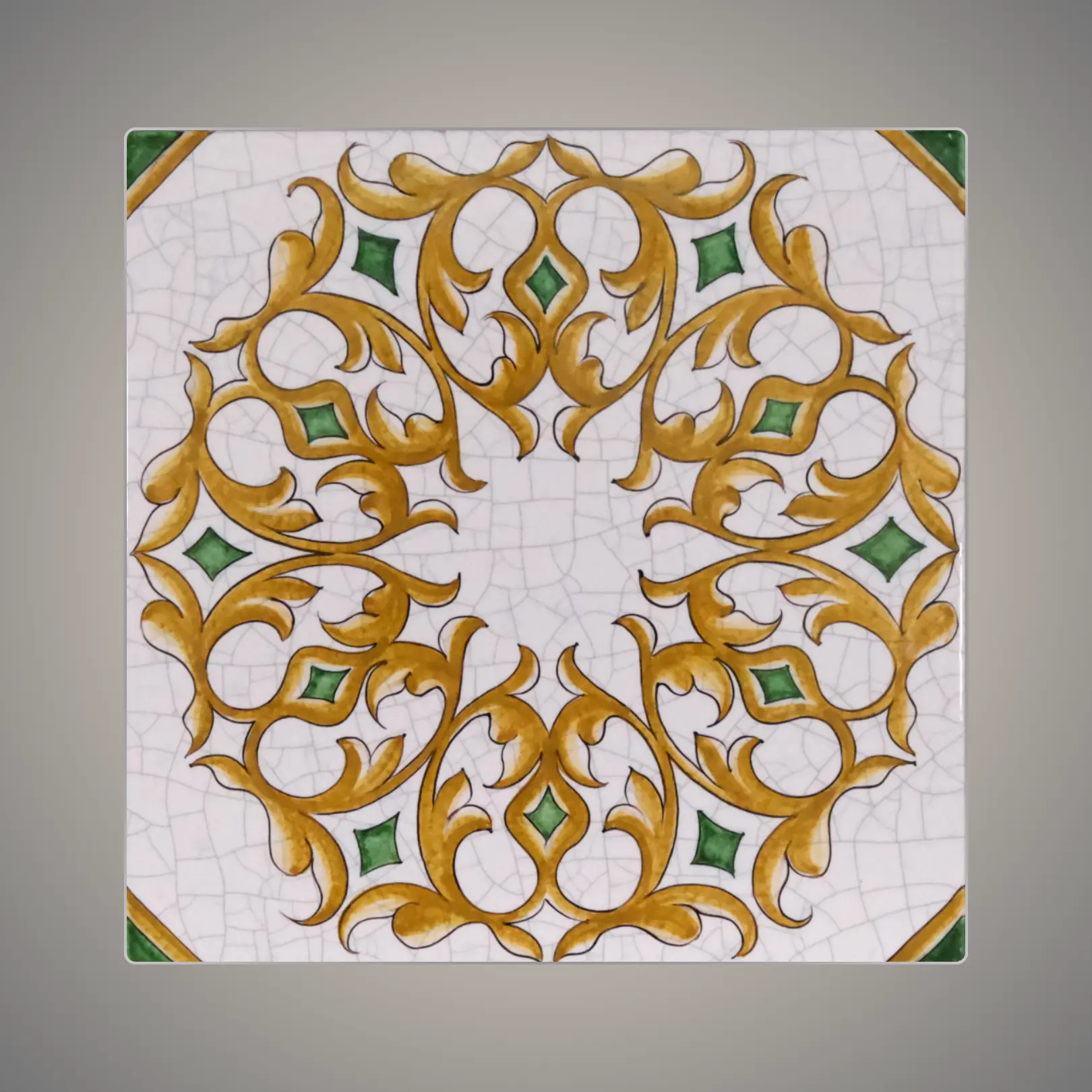 Discover the captivating elegance of the Golden Rosette lava stone tile. It brings a touch of classical grandeur to any space. This exquisite tile is a meticulously crafted work of art, inspired by the ornate, scrolling beauty of traditional Italian design. First, skilled artisans begin with a naturally resilient slice of volcanic lava stone, forging a canvas of incredible strength. Next, they intricately hand-paint the tile with a rich, floral design in a brilliant golden hue. Finally, they add delicate green accents, which serve to accentuate the tile’s sophisticated character.