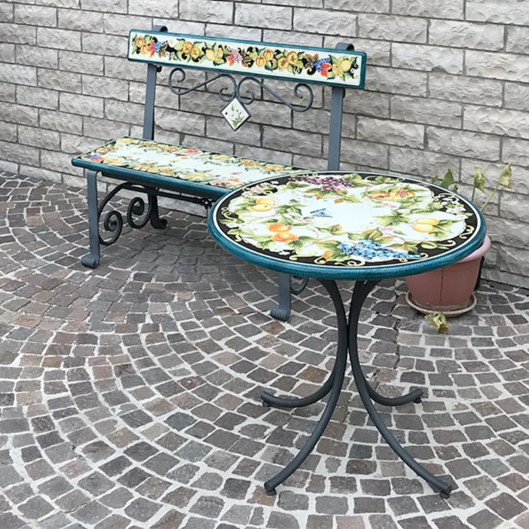 What truly defines this bench are its decorative elements. It is artfully adorned with reliefs or inlays of various fruits. These designs are meticulously carved directly into the stone. They might feature plump grapes, delicate citrus slices, or crisp apples. The fruit motifs bring a sense of life and vibrancy to the solid, dark stone.