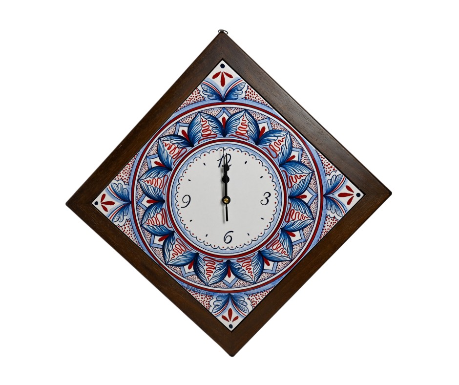 A stunning ceramic wall clock with intricate petal-inspired hand-painted designs in warm hues, framed elegantly in dark wood. Perfect for adding a touch of timeless artistry to any space.