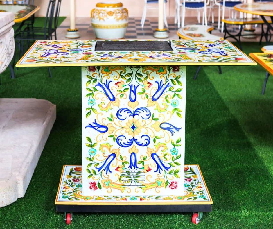 The Artisan Blossom Grill is a beautifully crafted outdoor grill that combines traditional craftsmanship with artistic design. Inspired by nature, it features intricate details resembling blooming flowers or delicate vine patterns, hand-painted on lava stone surface, adding a touch of elegance with colorful finishes or artistic touches. This grill serves as a functional cooking tool and at the same time offers a stunning outdoor centerpiece. Elevate your yard with Elegantico lava stone grill. Made in Italy, hand-painted by our talented artisan, it is the perfect choice for any space.