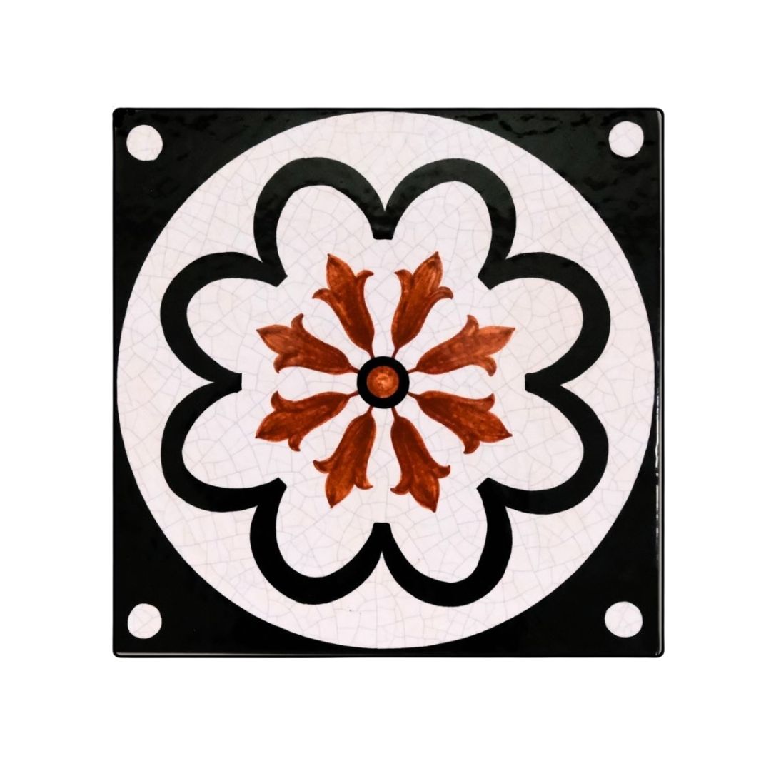 The Tuscan Blossom is a hand-painted lava stone tile that brings the rustic charm and warm hues of the Italian countryside into your home. This exquisite piece, meticulously crafted in Italy, seamlessly blends natural durability with classic artistry. First, artisans begin with a robust canvas of volcanic lava stone, a material naturally suited for both indoor and outdoor applications. Subsequently, they hand-paint a beautiful, stylized flower motif onto the surface, using a rich, terracotta-inspired palette. Ultimately, the intricate black and white patterns, combined with the subtle crazing in the glaze, give each tile a unique, rustic character.